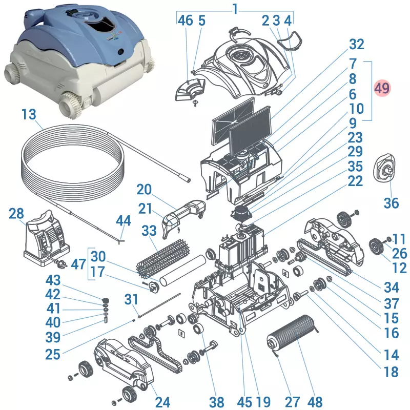 Individua il ricambio che ti occorre sull'immagine dell'esploso del robot, trova l'opzione con il numero corrispondente e inserisci la quantità desiderata.