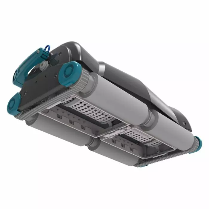 Le innovative spazzole in PVA rimuovono lo sporco dal fondo vasca, mentre la pompa doppia Dual Drive con portata da 38 m³/h convoglia lo sporco all'interno dei due sacchi filtro ad altà capienza.