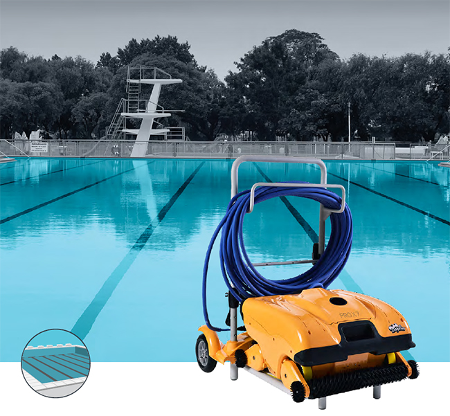 Il Robot Dolphin PRO X 7 Gyro by Maytronics è un pulitore di tipo commerciale perfetto per rimuovere sporco e impurità dal fondo di piscine fino a 50 metri di lunghezza (500 mq).