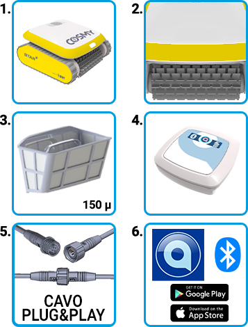 Cosmy Star è inoltre dotato di un avanzato algoritmo AquaSmart Touch che unito al sistema di navigazione GYRO è in grado di rilevare e aggirare gli ostacoli in acqua e ridurre al minimo il rischio di attorcigliamento del cavo.