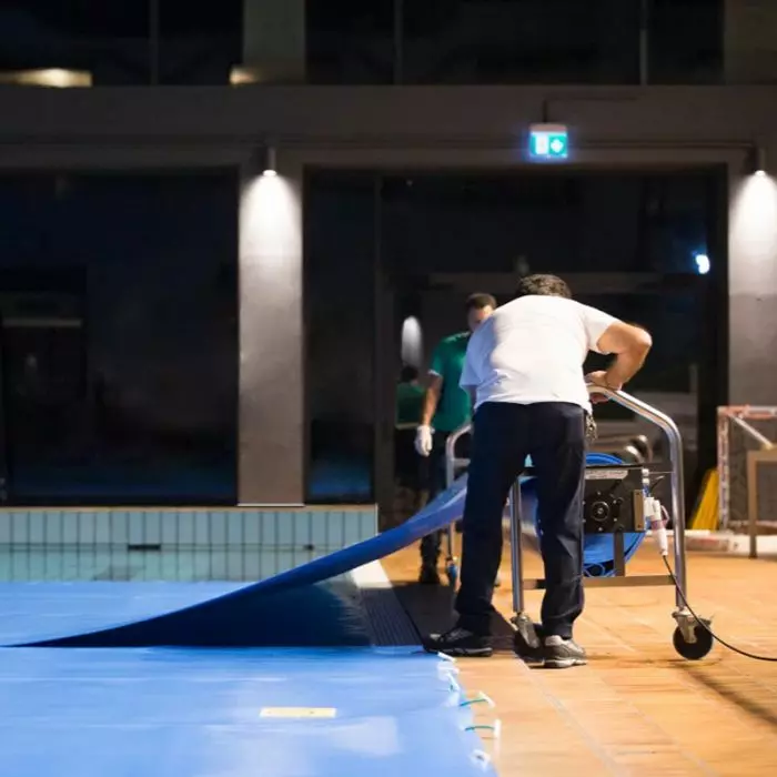 Per avvolgere la copertura dovranno essere impiegate sempre 2 persone (una che tende la corda di traino del telo e l’altra che mantiene attiva la chiave con molla di ritorno).