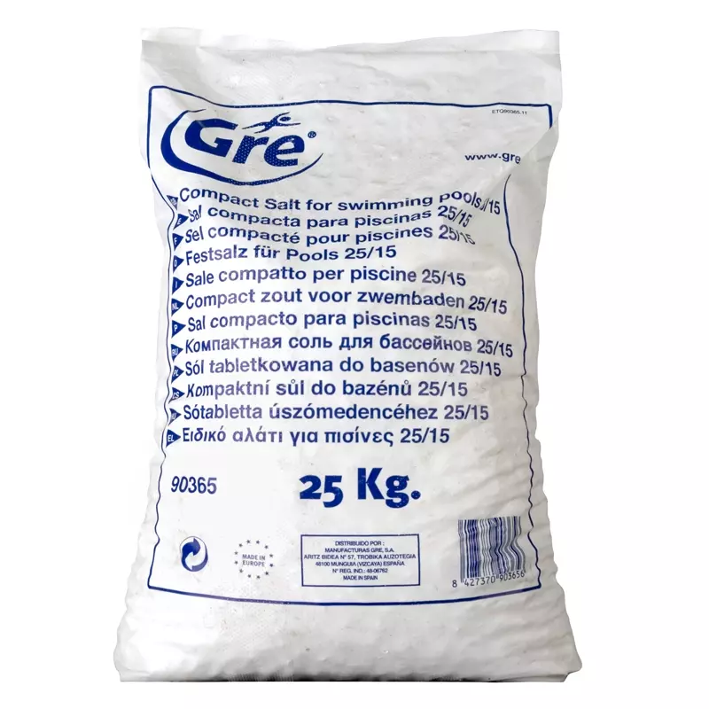 Sale compatto Gre, sacco da 25 KgIl sale compatto Gre è perfetto per piscine con sistemi di clorazione salina o elettrolisi al sale. Questo sale di alta qualità è privo di sostanze insolubili, odori e sapori strani, assicurando che l'acqua della tua piscina rimanga pulita e limpida.