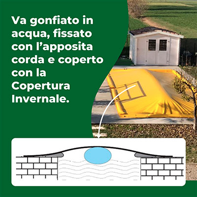 Realizzato in resistente PVC calandrato  e dotato di una pratica valvola a vite, questo accessorio crea una leggera pendenza sulla copertura, permettendo all'acqua piovana di defluire ai lati della piscina, mantenendo la superficie sempre asciutta.