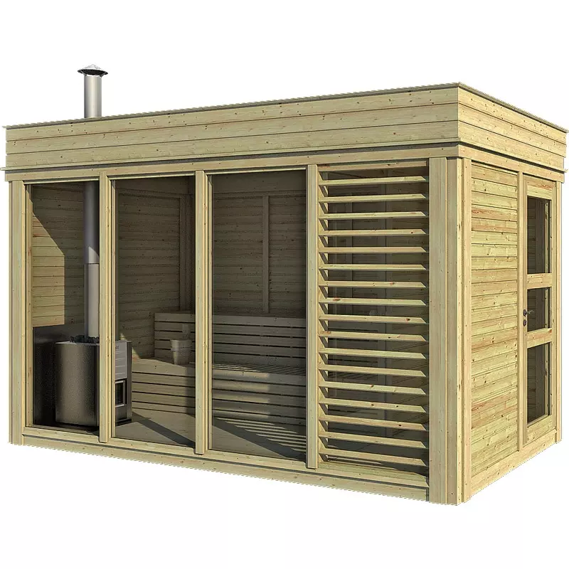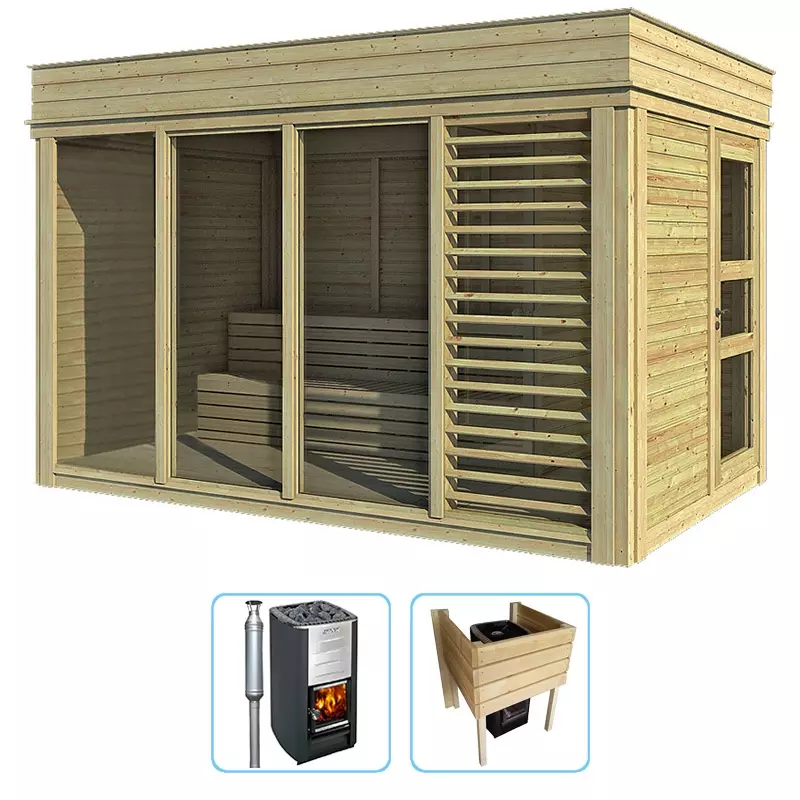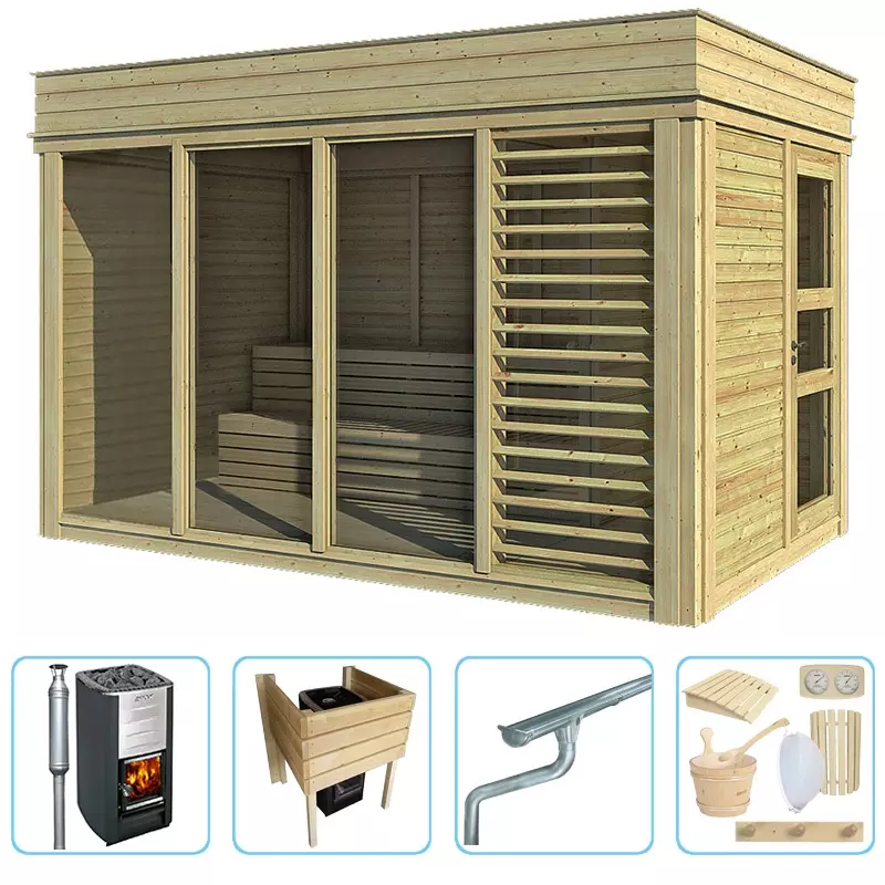 La sauna può essere equipaggiata con una stufa a legna oppure con una stufa elettrica, e può essere dotata di sistema di grondaie per il deflusso delle acque.