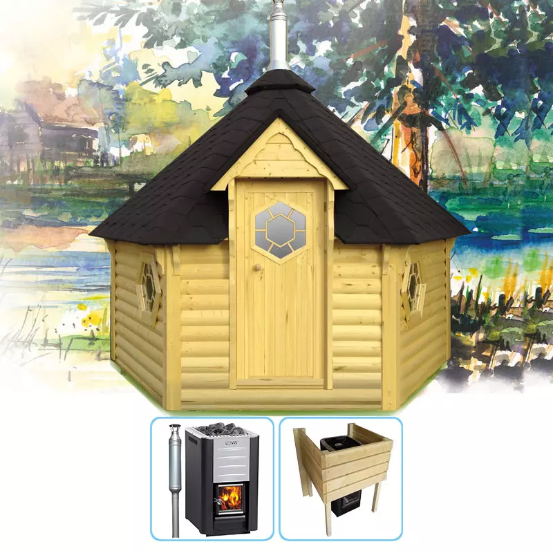 Scopri il piacere di rilassarti direttamente nel tuo giardino, grazie alla sauna tradizionale da esterno ODINO con spogliatoio.