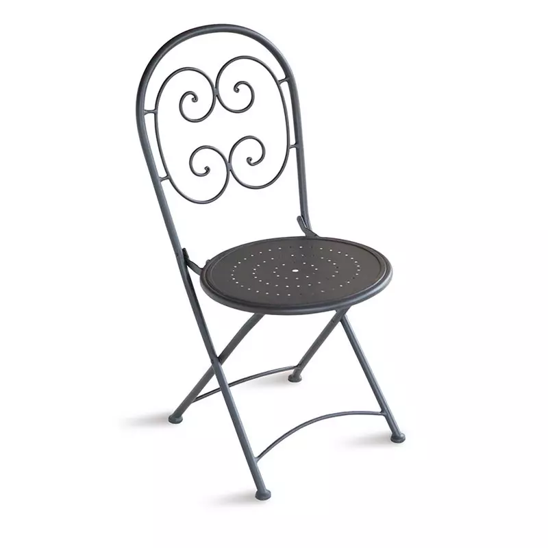 La sedia da giardino ORTA è realizzata in ferro color grigio antracite e presenta uno schienale con motivo arricciato molto gradevole.