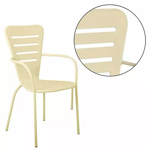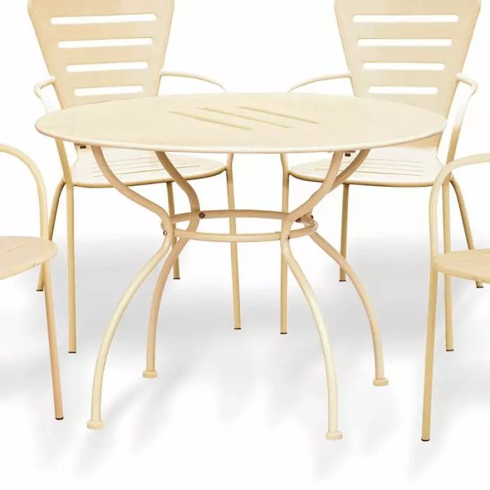 Questo set è formato da un tavolo rotondo diametro 106 cm e da quattro sedie decorate a trama traforata ed hanno schienale alto e comodi braccioli. Si possono impilare quando non utilizzate, per ridurre al minimo lo spazio occupato.