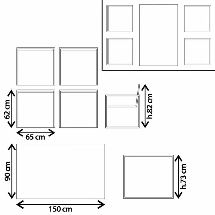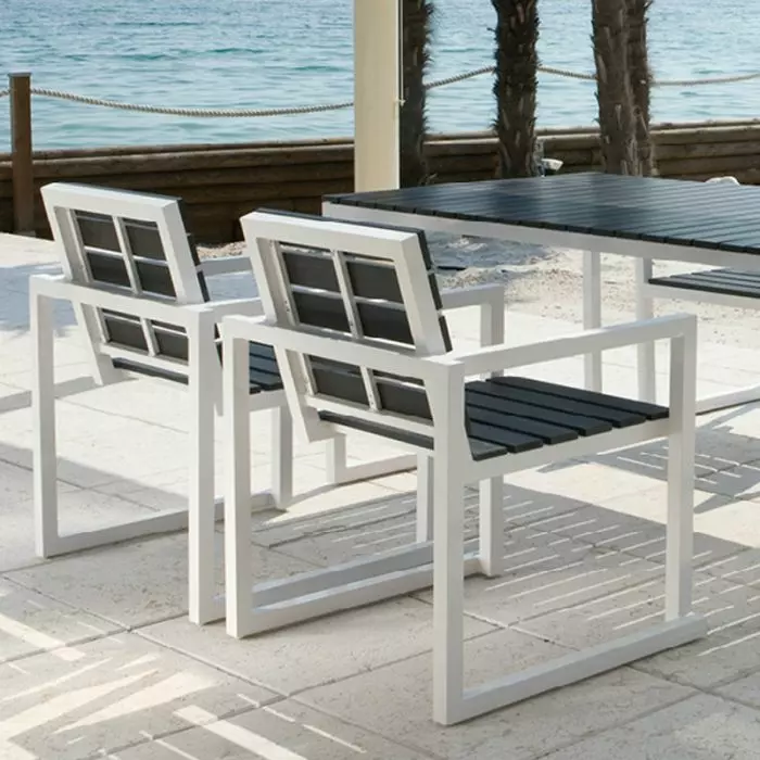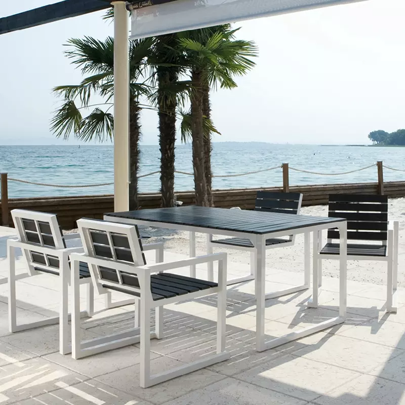 La struttura è in resistente alluminio verniciato color bianco; il piano del tavolo, le sedute e gli schienali sono in WPC, legno composito: la bellezza del legno unita alla praticità di pulizia delle resine!