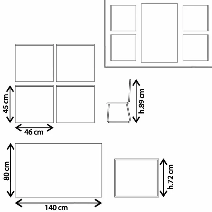 - tavolo: 140 x 80 x H 72 cm