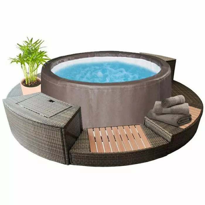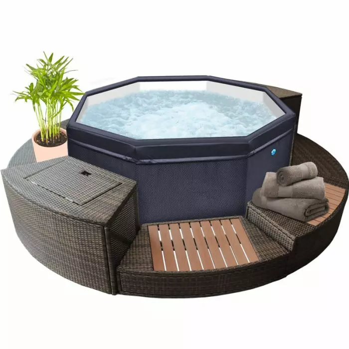 Infine, il set include anche un pratico locale tecnico vuoto per nascondere il blocco motore della spa e una pedana in legno composito per facilitare l'accesso in vasca.
