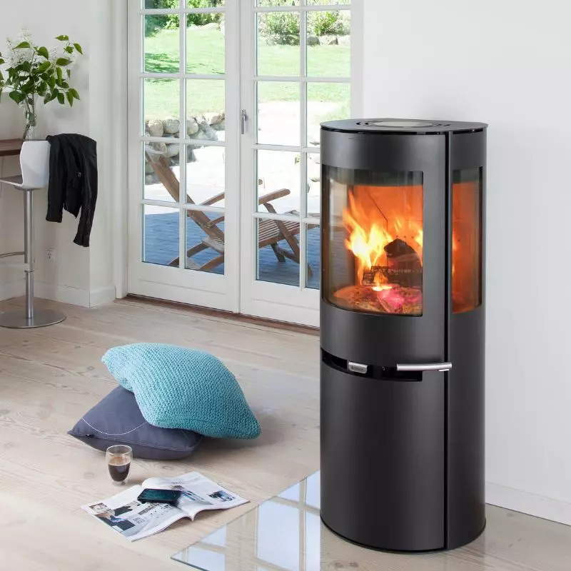 La stufa Aduro 9.5 alimentata a legna, a convenzione naturale, si distingue per il suo particolare design. È alta 1,20 m per una larghezza di soli 50 cm, perfetti per ambienti dai soffitti alti, grandi fino a 140 m².