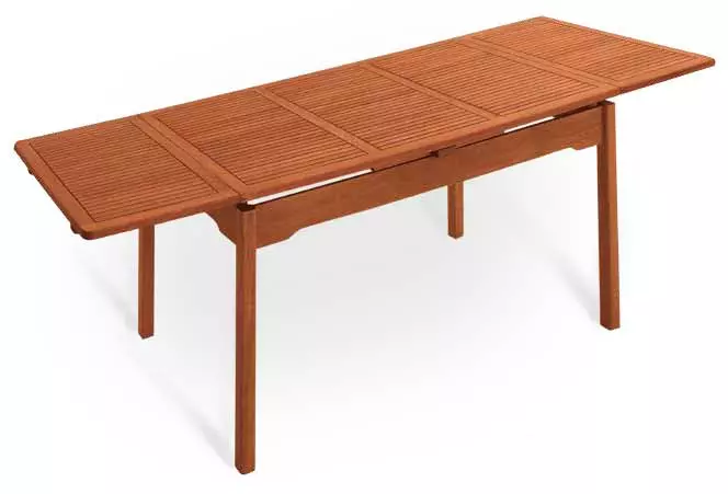 Quando si utilizza il tavolo chiuso le prolunghe trovano alloggiamento sotto il piano del tavolo, mentre quando abbiamo un amico in più a cena si estraggono un movimento a scorrimento: l'utilizzo delle estensioni è indipendente, quindi si può allungare il tavolo da solo un lato, senza minare la stabilità della struttura. Il legno utilizzato è di keruing, un legno duro particolarmente adatto per l'utilizzo all'aperto.