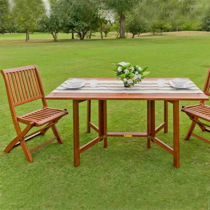 Il tavolo Papavero può essere completato con sedie pieghevoli nello stesso legno di keruing.