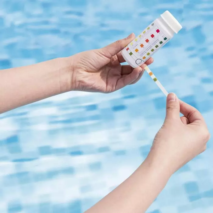 Il test è composto da piccole striscette che si colorano in base in base ai livelli attuali di cloro, ph e alcalinità dell'acqua.