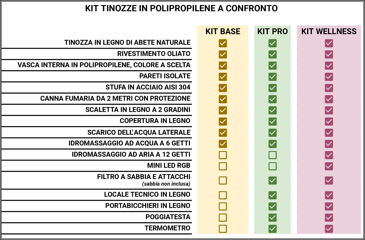 La tinozza Baldr è proposta in tre pratici kit pensati per rispondere ad ogni tua esigenza; il KIT BASE è fornito con il necessario al corretto funzionamento, oltre ad un sistema idromassaggio con getti ad acqua, mentre il KIT PRO include anche un pratico filtro a sabbia per mantenere l'acqua sempre pulita, un locale tecnico in legno e un kit di accessori per la manutenzione ordinaria.