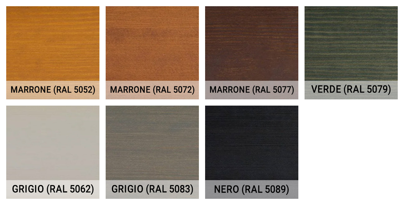 Nota: La colorazione finale della struttura potrebbe variare leggermente dai colori mostrati a schermo a seconda delle caratteristiche del legno, della sua porosità e del grado di assorbimento della vernice.