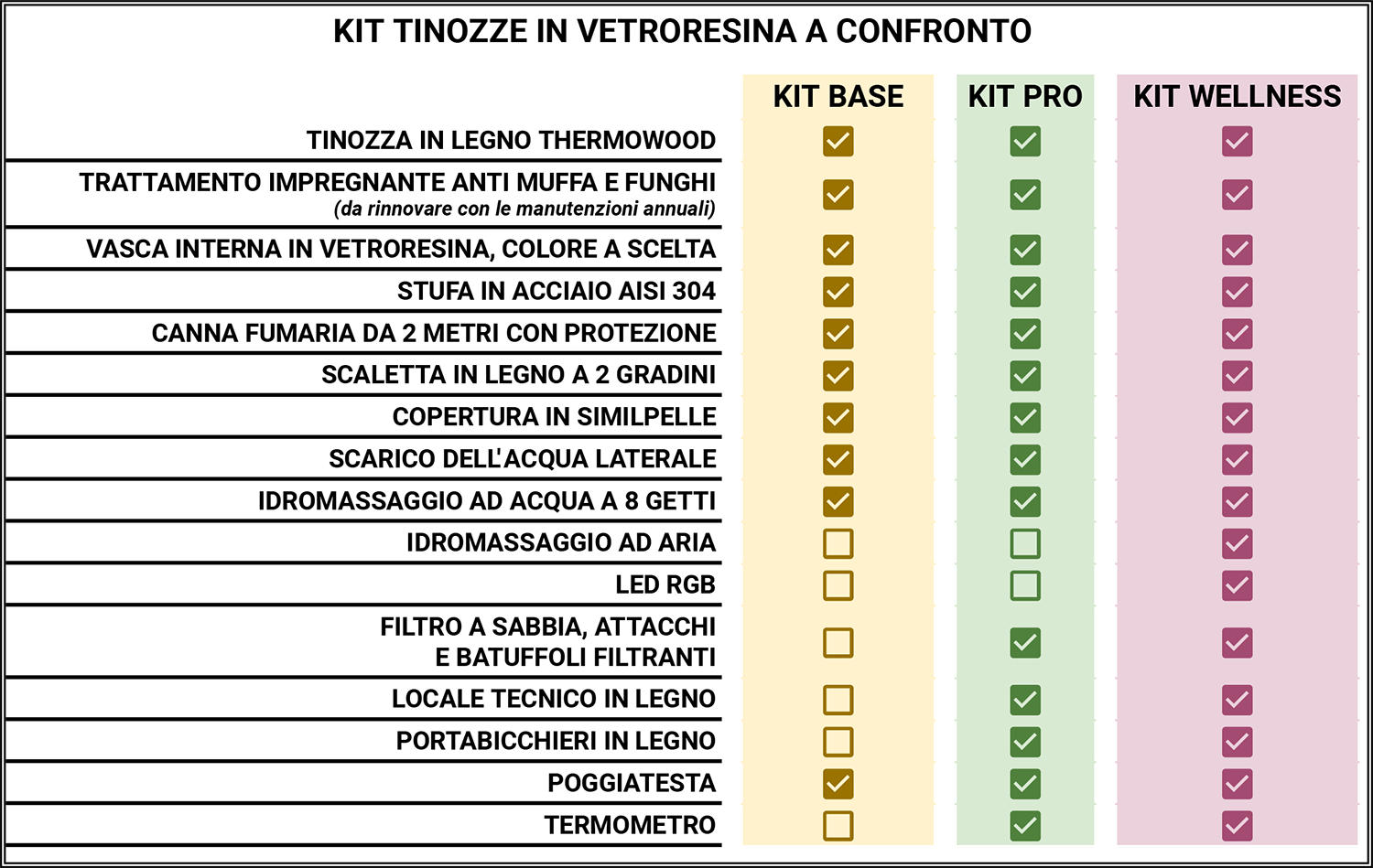 NETTUNO è proposta in 3 differenti kit per rispondere ad ogni esigenza: BASE che include i componenti necessari al corretto funzionamento della tinozza e kit PRO che include anche un filtro a sabbia con sfere filtranti Aqualoon, un locale tecnico in legno e un kit accessori con termometro galleggiante, pagaia in legno e pratica mensola per appoggiare bevande e cocktail.