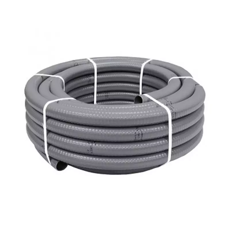 Tubo semirigido classico in PVC di colore grigio con rinforzo spiralato interno e superficie liscia esterna.