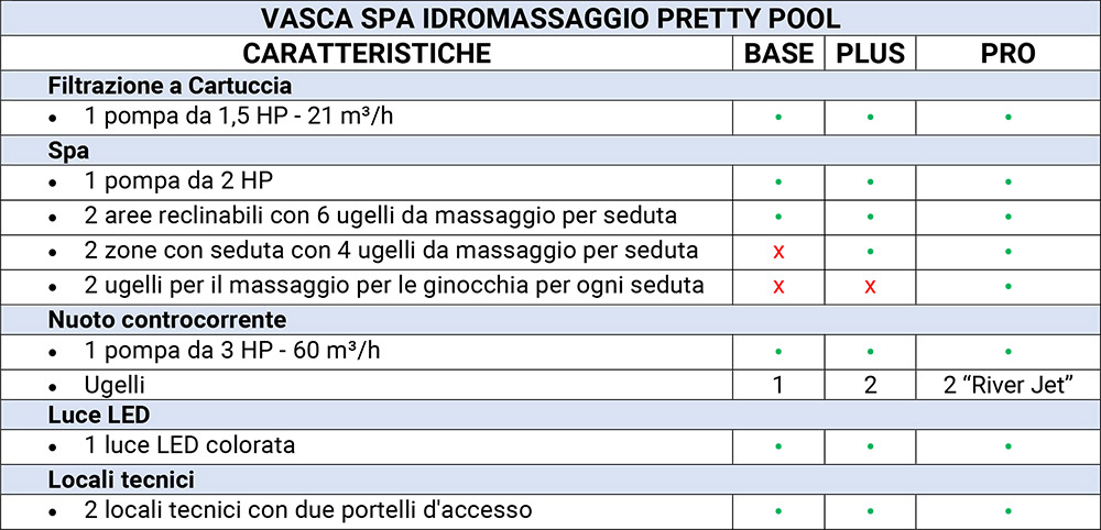 Per il comparto equipaggiamenti spa, oltre al nuoto controcorrente, le vasche PrettyPool sono fornite di una pompa da 2 HP che erogano potenza a 2 sedute allungate con 6 bocchette idromassaggio ciascuna