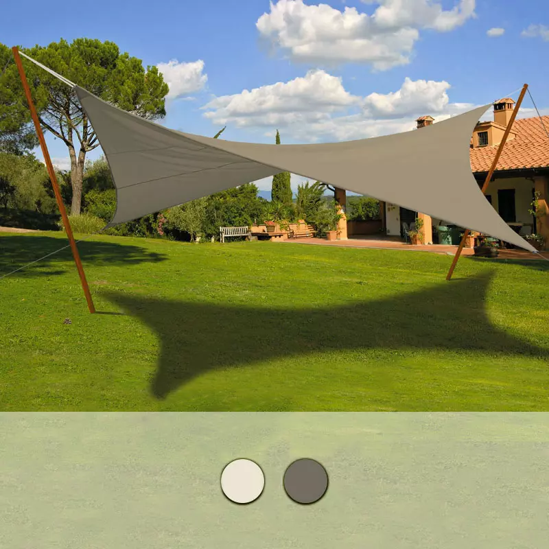 Abbinando dimensioni, forme e colori diversi potremo creare delle zone dinamiche e vivaci, sostituendo le classiche tende, ombrelloni o gazebi. Tiranti elastici inseriti nei bordi, corda in dotazione. Teli disponibili nei colori ecru e tortora.